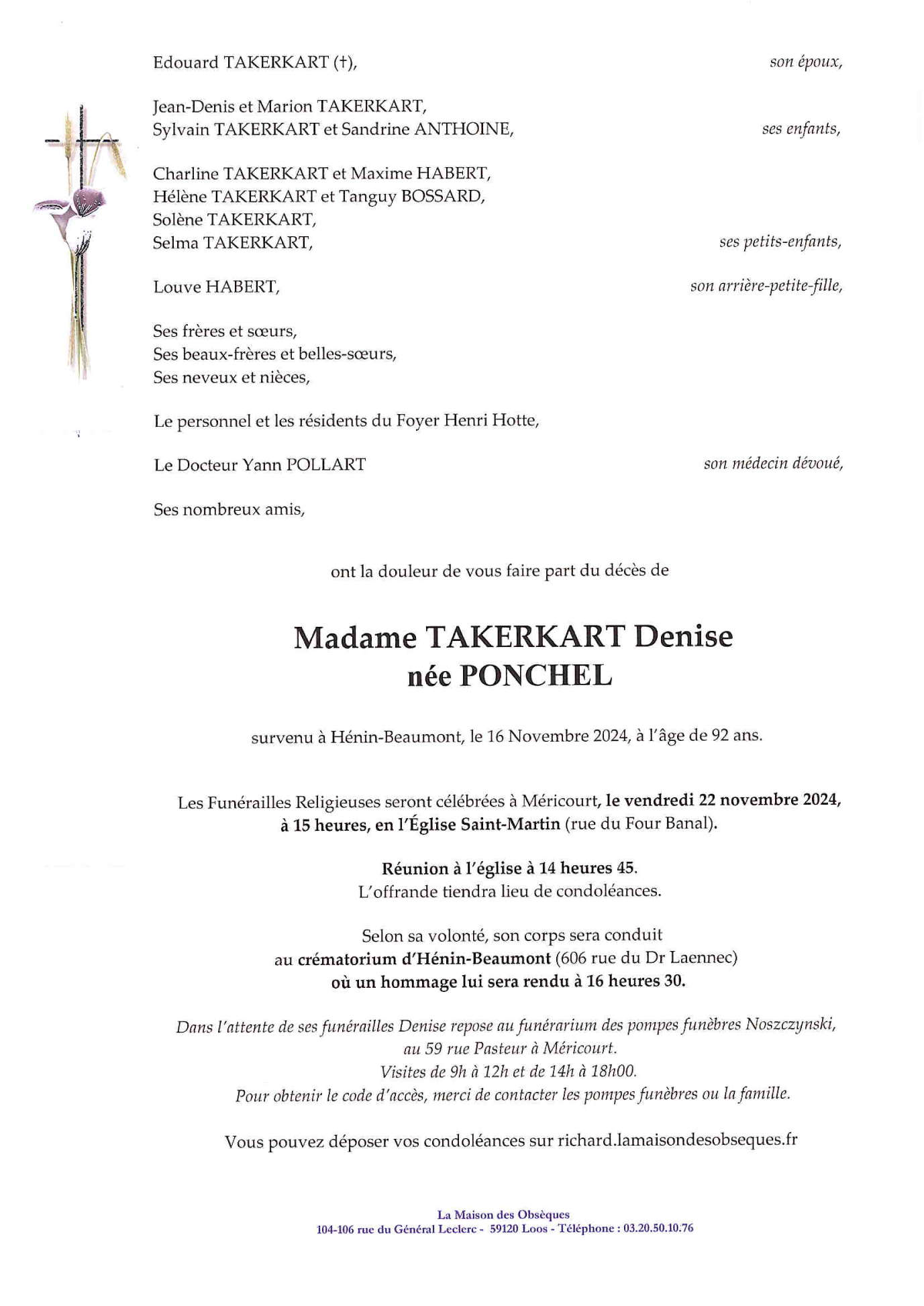 Décédée à Hénin-Beaumont (62110, France) le samedi 16 novembre 2024 à l'âge de 92 ans