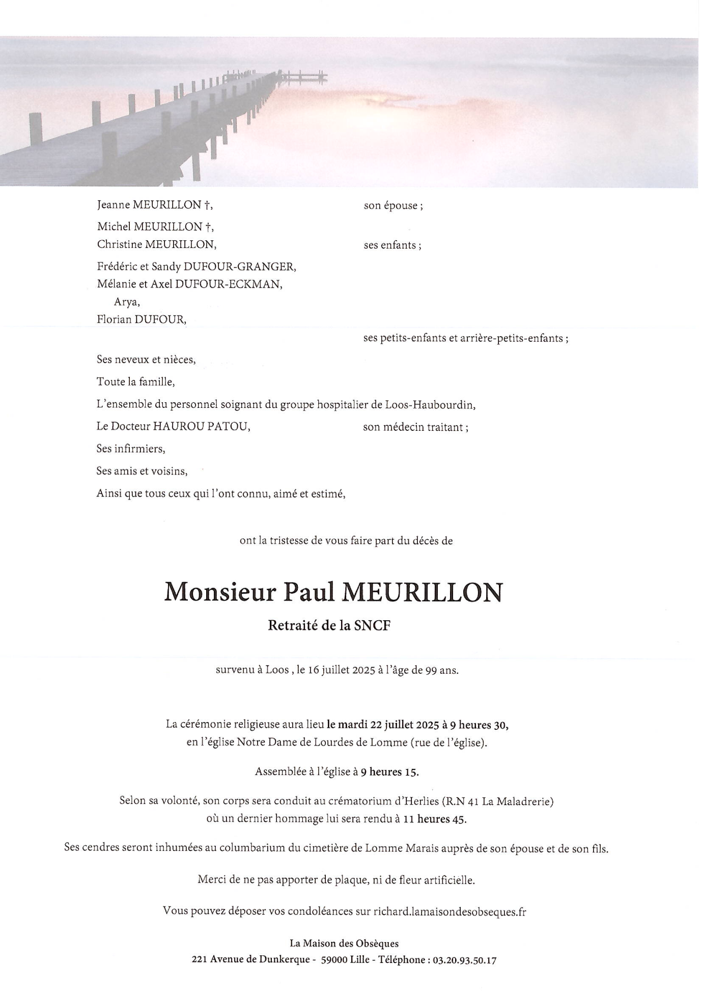 Décédé à Loos (59120, France) le mercredi 16 juillet 2025 à l'âge de 99 ans