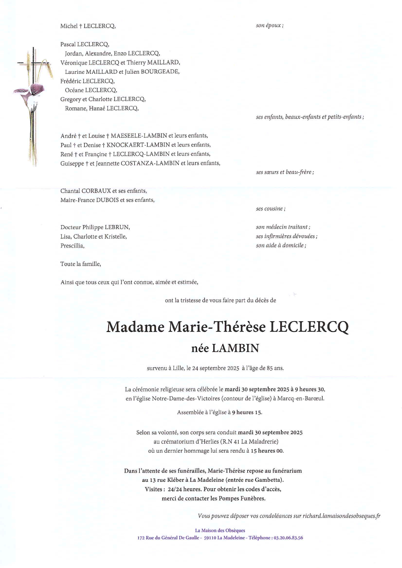 Décédée à Lille (59000, France) le mercredi 24 septembre 2025 à l'âge de 85 ans