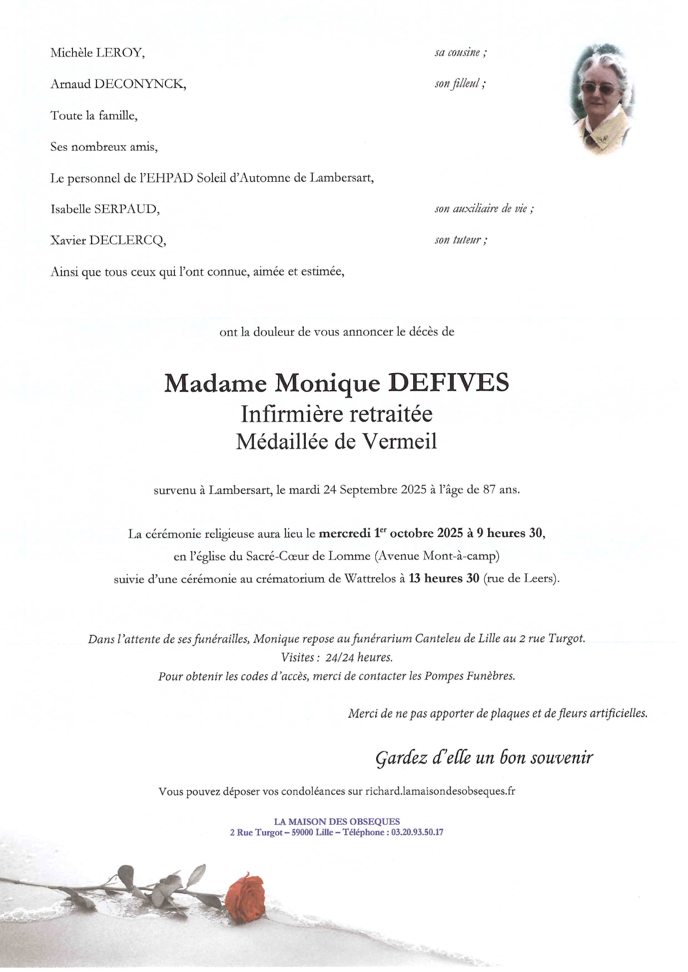 Décédée à Lambersart (59130, France) le mercredi 24 septembre 2025 à l'âge de 87 ans