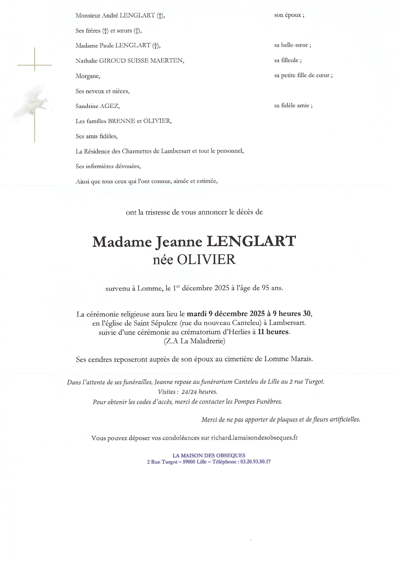 Décédée à Lomme (59160, France) le dimanche 1 décembre 2024 à l'âge de 94 ans