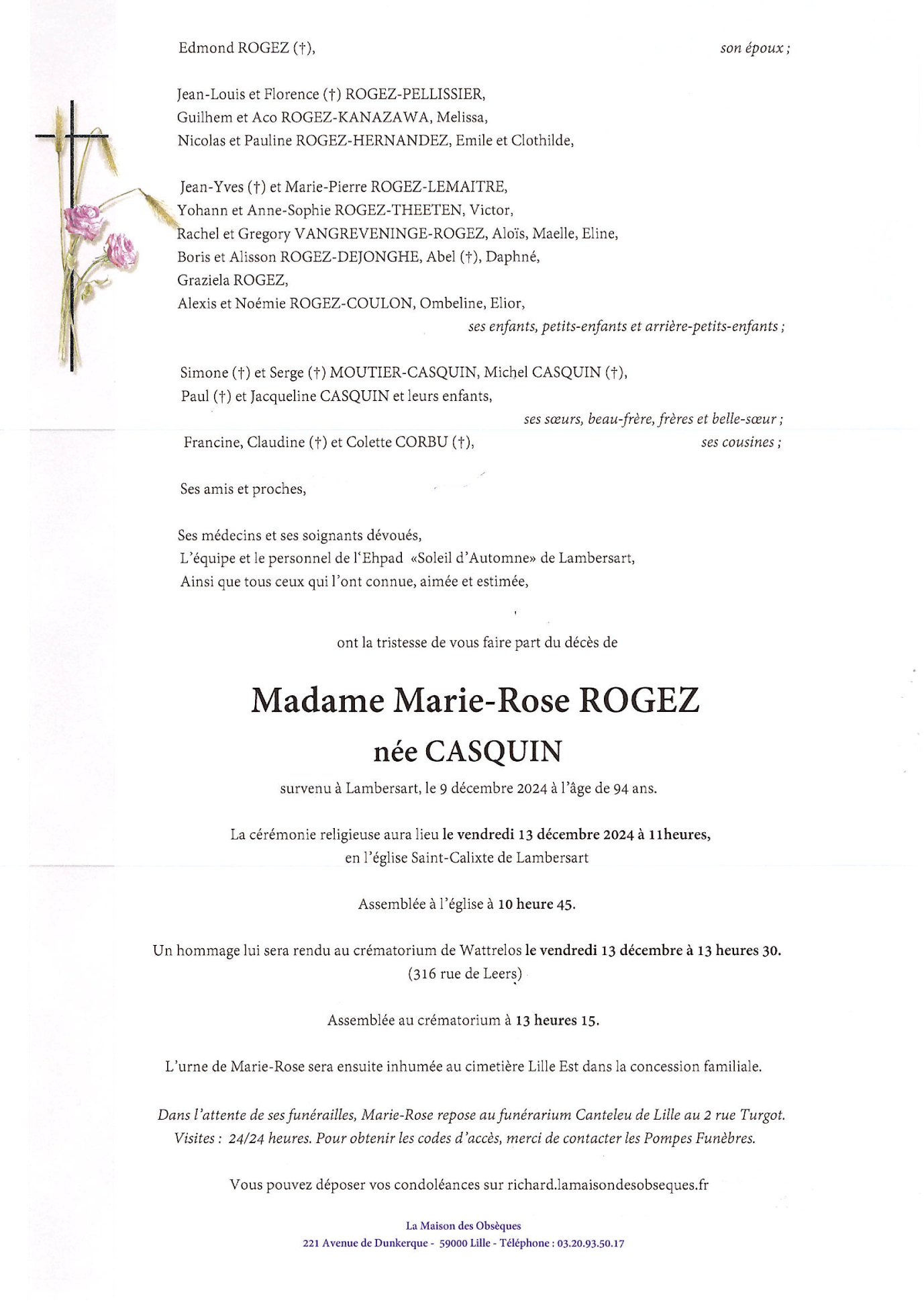 Décédée à Lambersart (59130, France) le lundi 9 décembre 2024 à l'âge de 94 ans