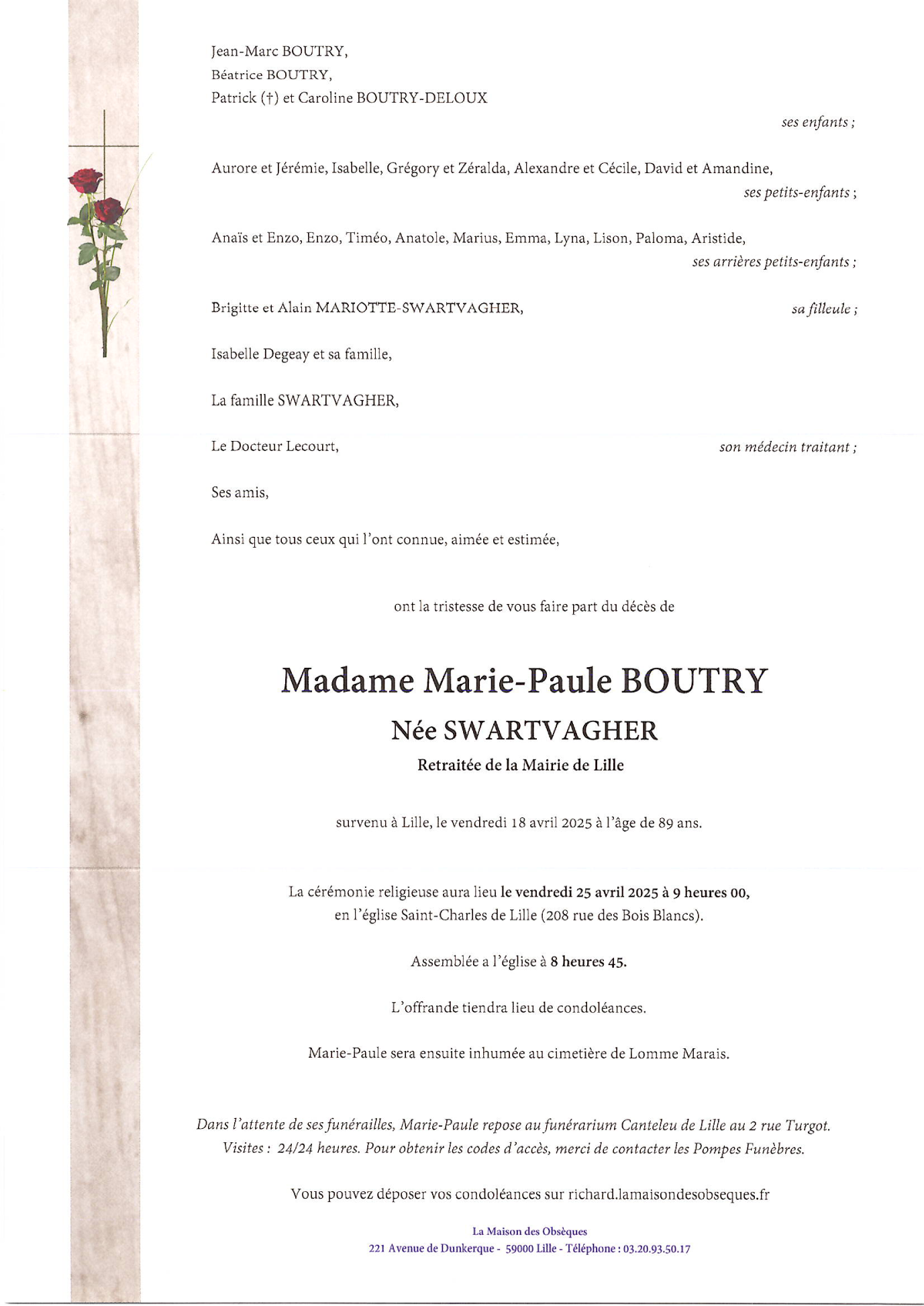 Décédée à Lille (59000, France) le vendredi 18 avril 2025 à l'âge de 89 ans