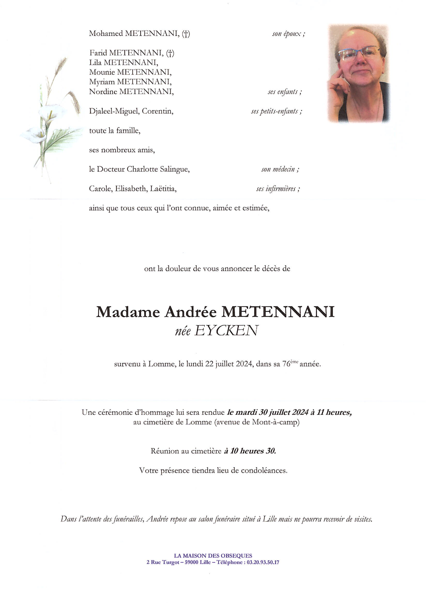 Décédée à Lomme (59160, France) le lundi 22 juillet 2024 à l'âge de 75 ans