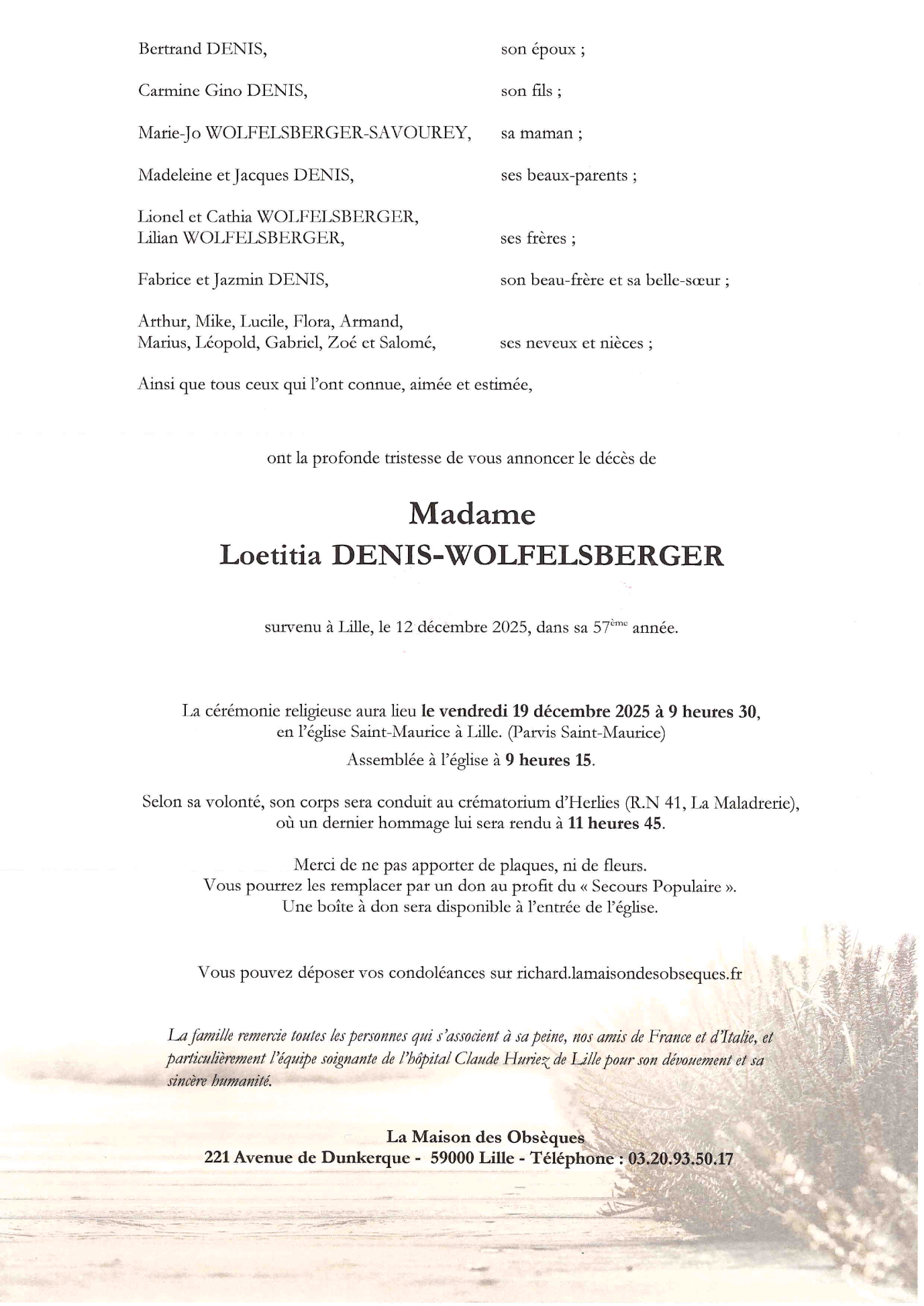 Décédée à Lille (59000, France) le vendredi 12 décembre 2025 à l'âge de 57 ans