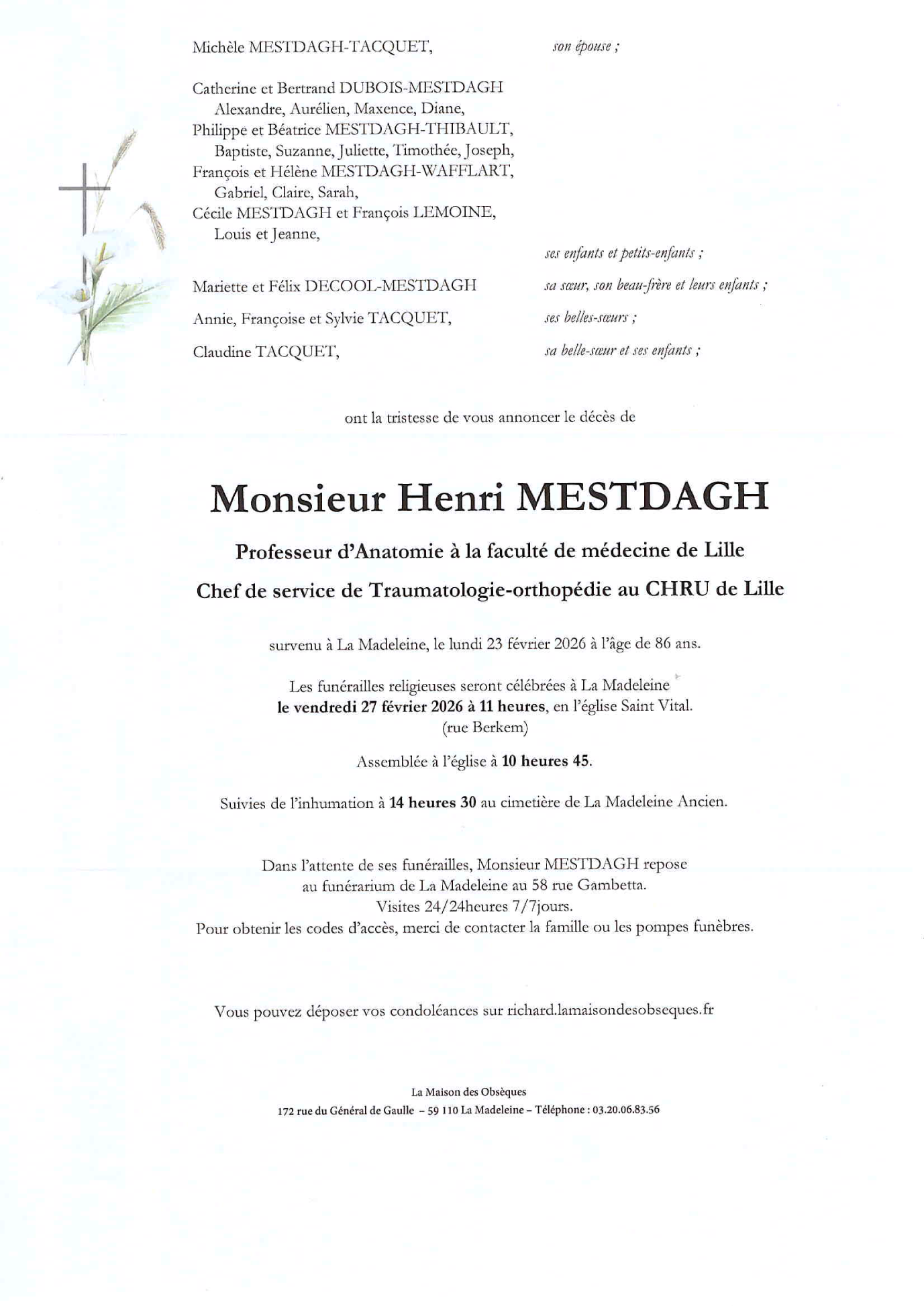 Décédé à La Madeleine (59110, France) le lundi 23 février 2026 à l'âge de 86 ans